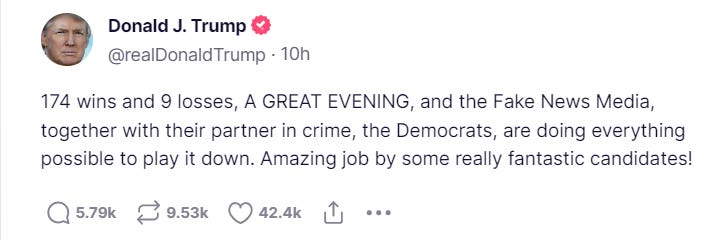 No one is denying an election yet: One thing that’s interesting and important to recognize is no one is denying an election yet, not even Trump. On Truth Social, he seems to endorse the current results, spinning the night as a victory. For all the bluster about unsecure elections, we’re just not seeing candidates challenge loses.